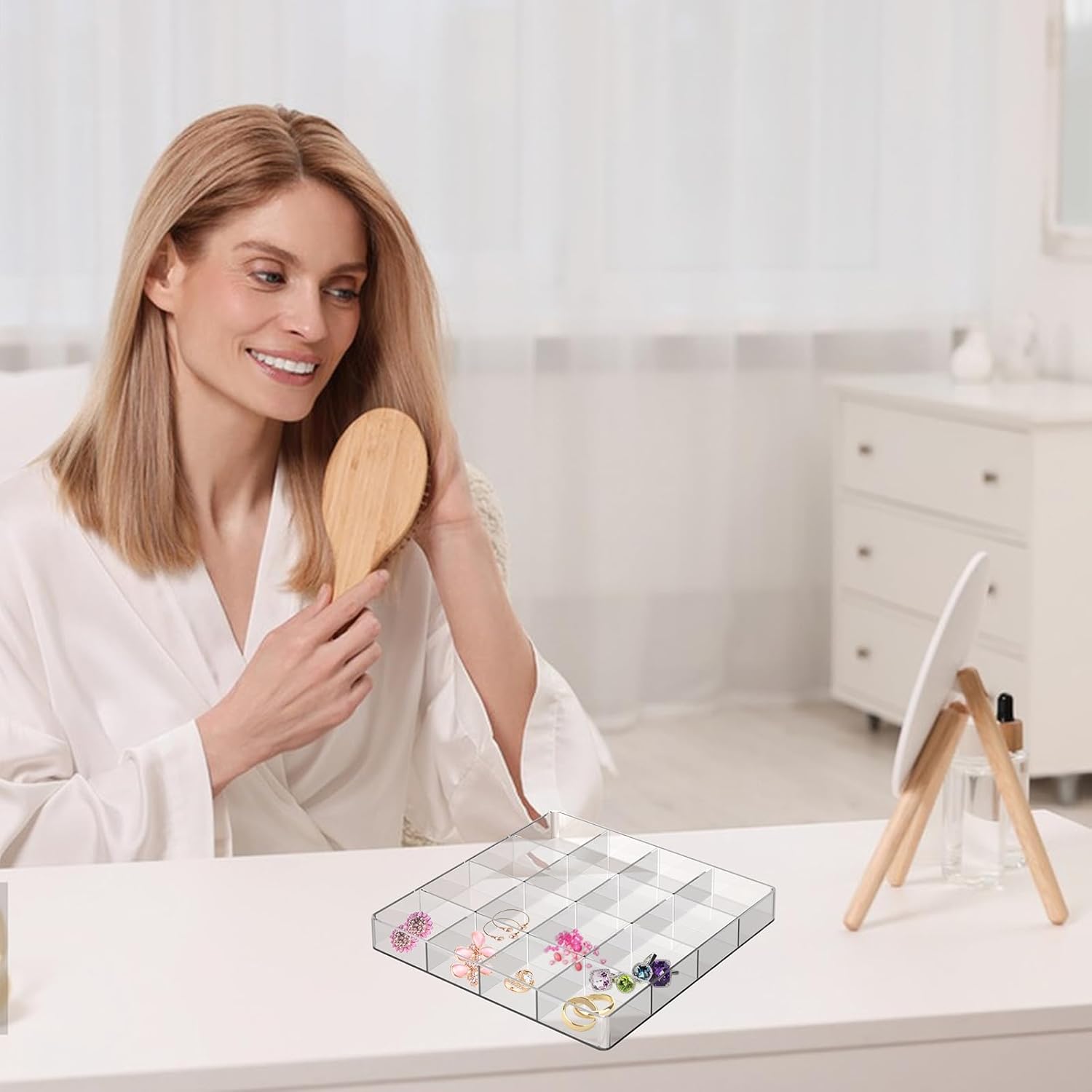 Our jewelry organizer tray can seamlessly fit into vanity drawers, bathroom drawers, and desk drawers, ensuring that your daily essentials are always neatly organized and easily accessible.