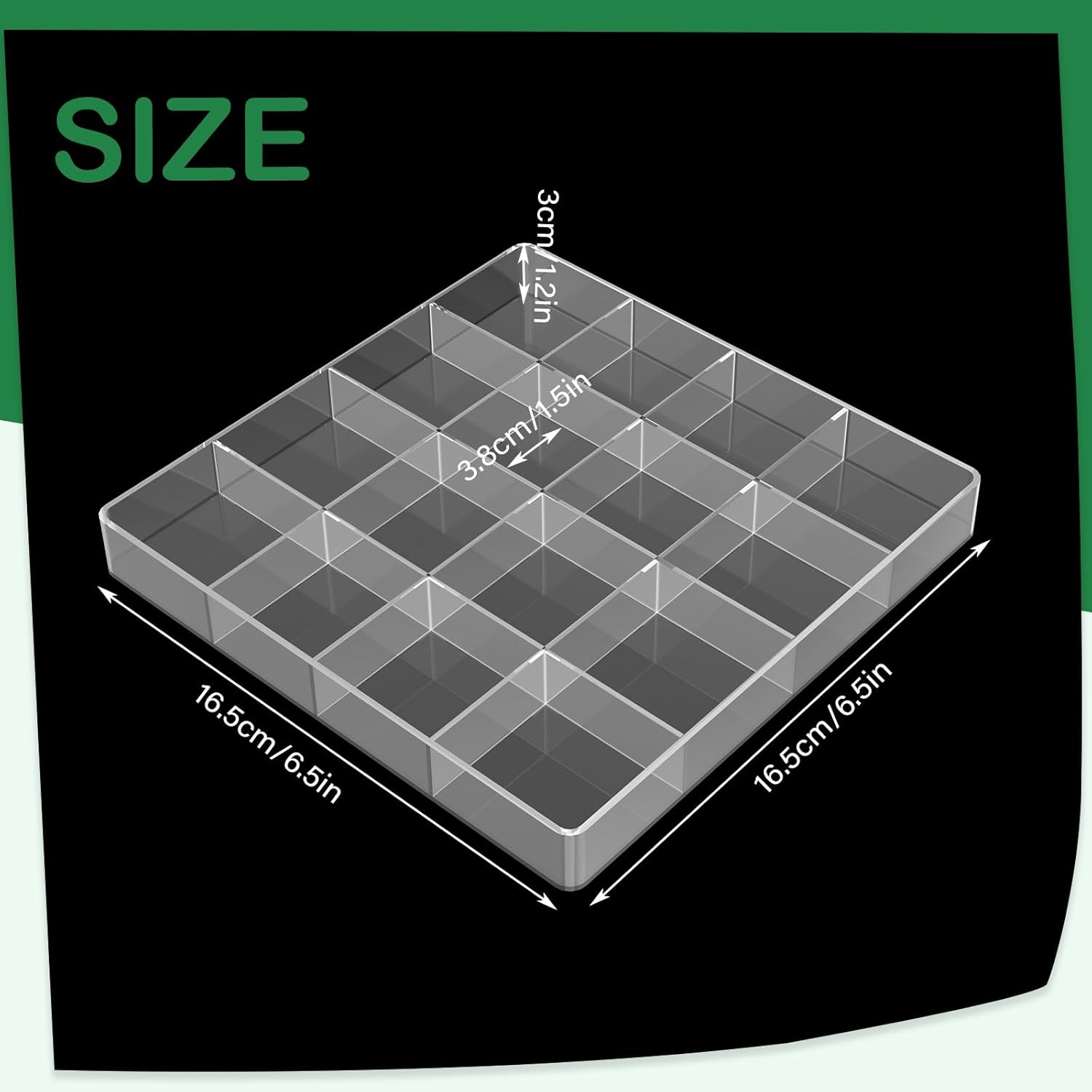 Perfect Size and Compartmentalization: Measuring 6.5 x 6.5 x 1.18 inches, this tray features 16 divided compartments, each measuring 1.5 x 1.5 inches, providing ideal storage for a variety of small items