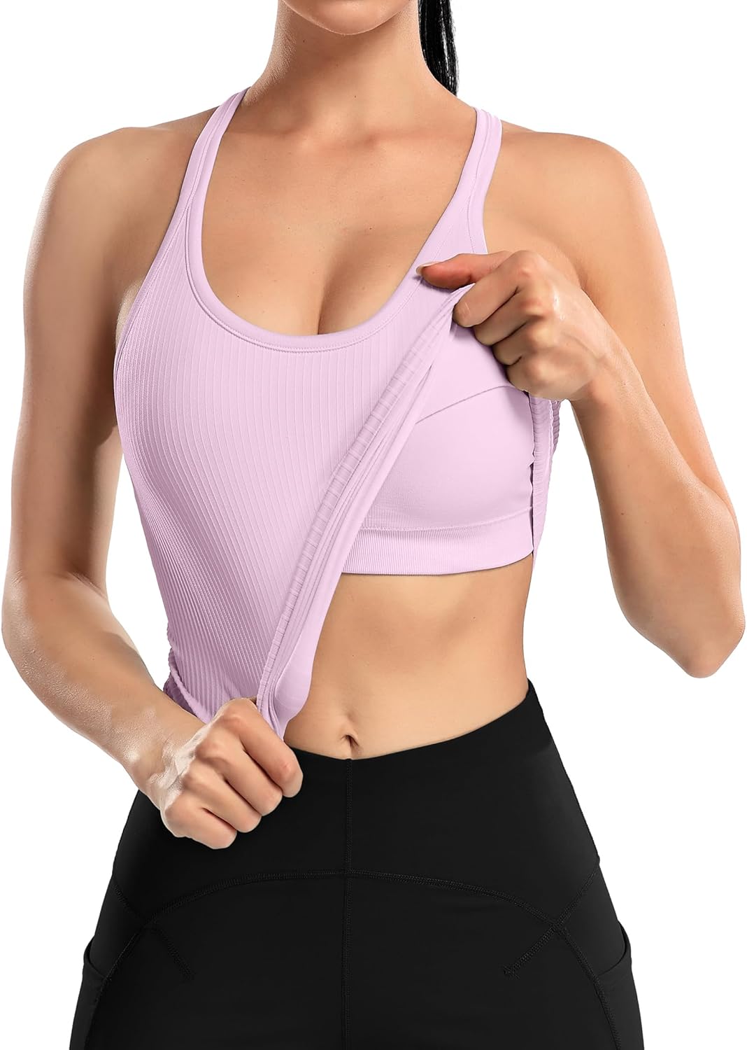 ATTRACO Women Ribbed Workout Crop Tops with Built in Bra Yoga Racerback Tank Top Tight Fit