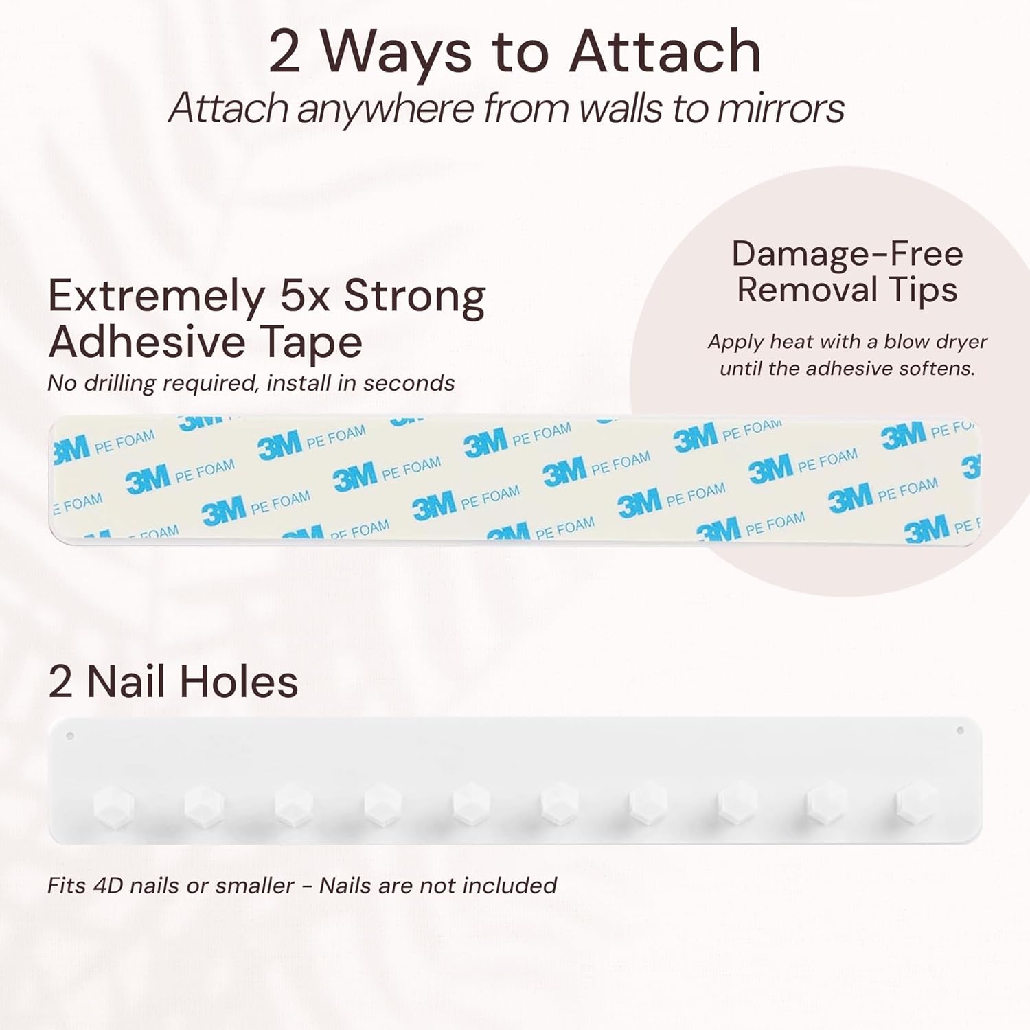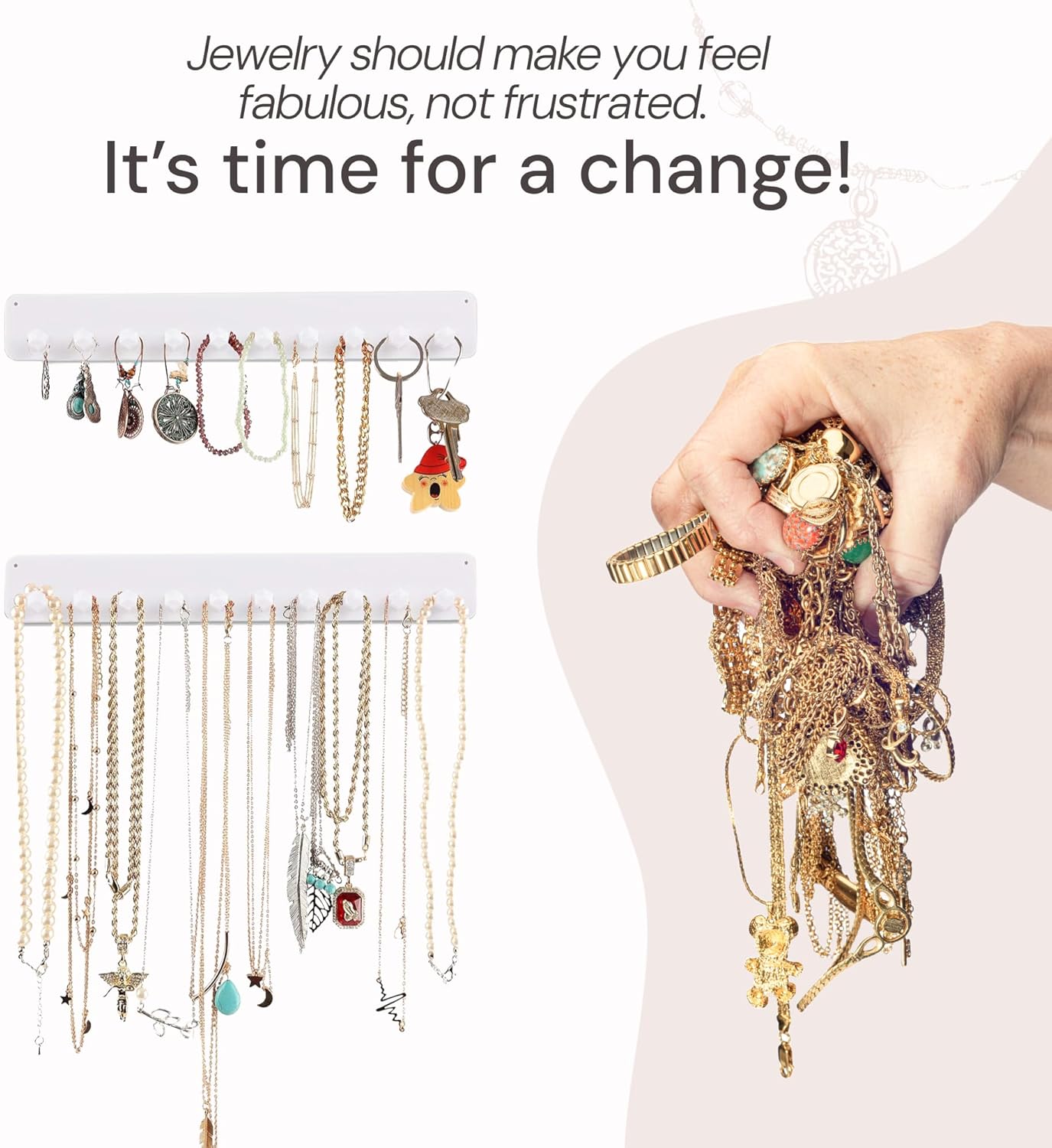 Effortless Installation: Secure the wall mount jewelry organizers using nails or the robust 3M adhesive backing. Unlike flimsy alternatives, our jewelry wall organizer ensures a firm hold, making it a reliable choice for necklace storage