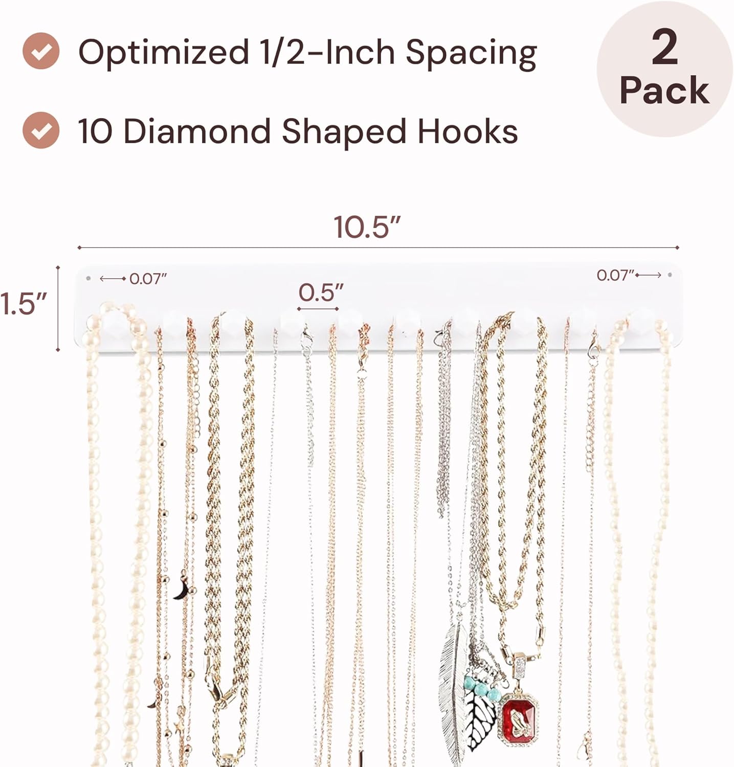 Elegant Necklace Holder Organizer: Efficiently organize and display your jewelry with this sophisticated 10-hook wall jewelry organizer. Prevent misplacement and save time with ample spacing for thicker chains. Each pack includes two white necklace hangers for optimal jewelry storage. This jewelry holder can also be used as bracelets, keys, or earrings holder organizer