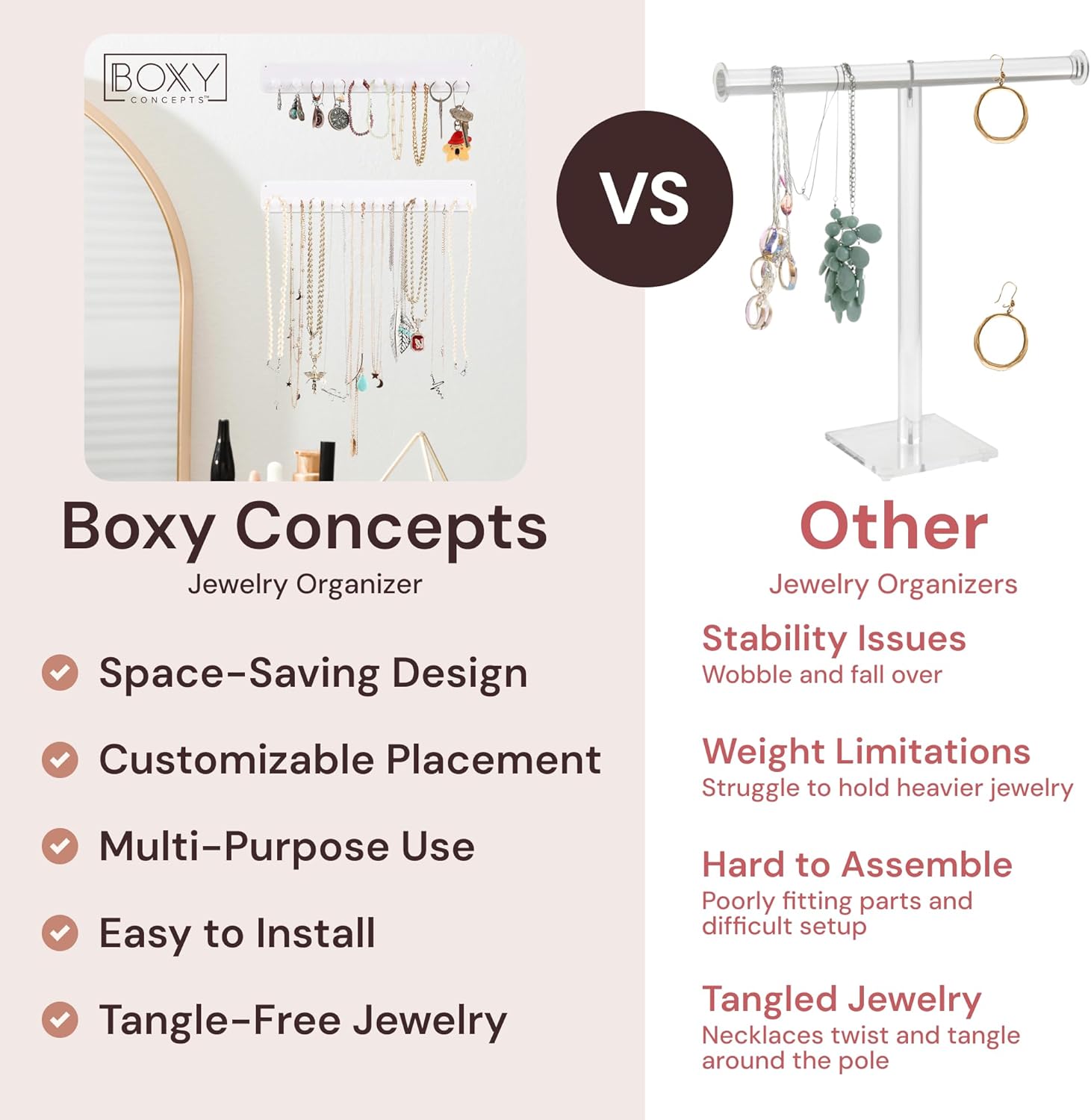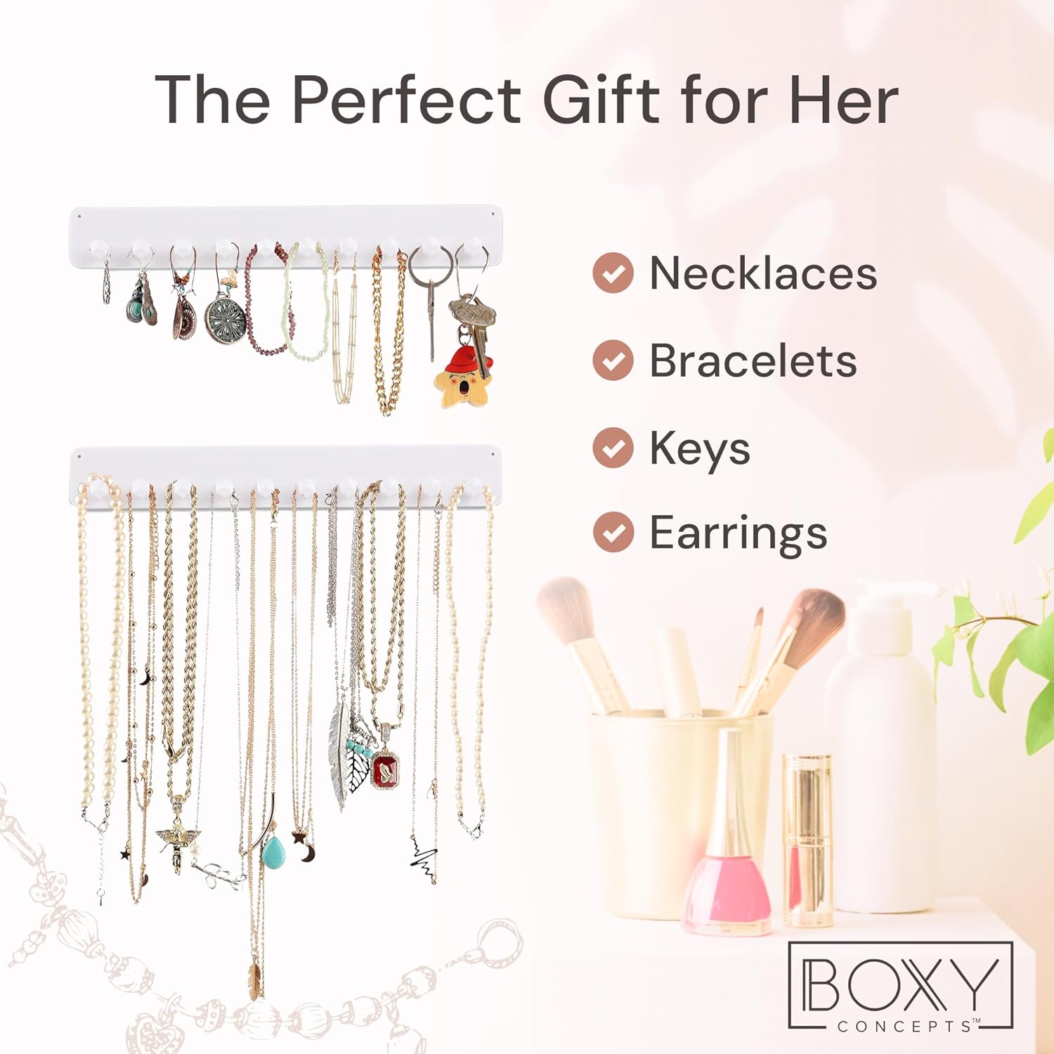Brand Assurance: Experience confidence in your purchase with our white jewelry organizer or necklace organizer wall set. Boxy Concepts is dedicated to providing innovative jewelry storage solutions, ensuring your hanging jewelry organizer meets your expectations in style and functionality