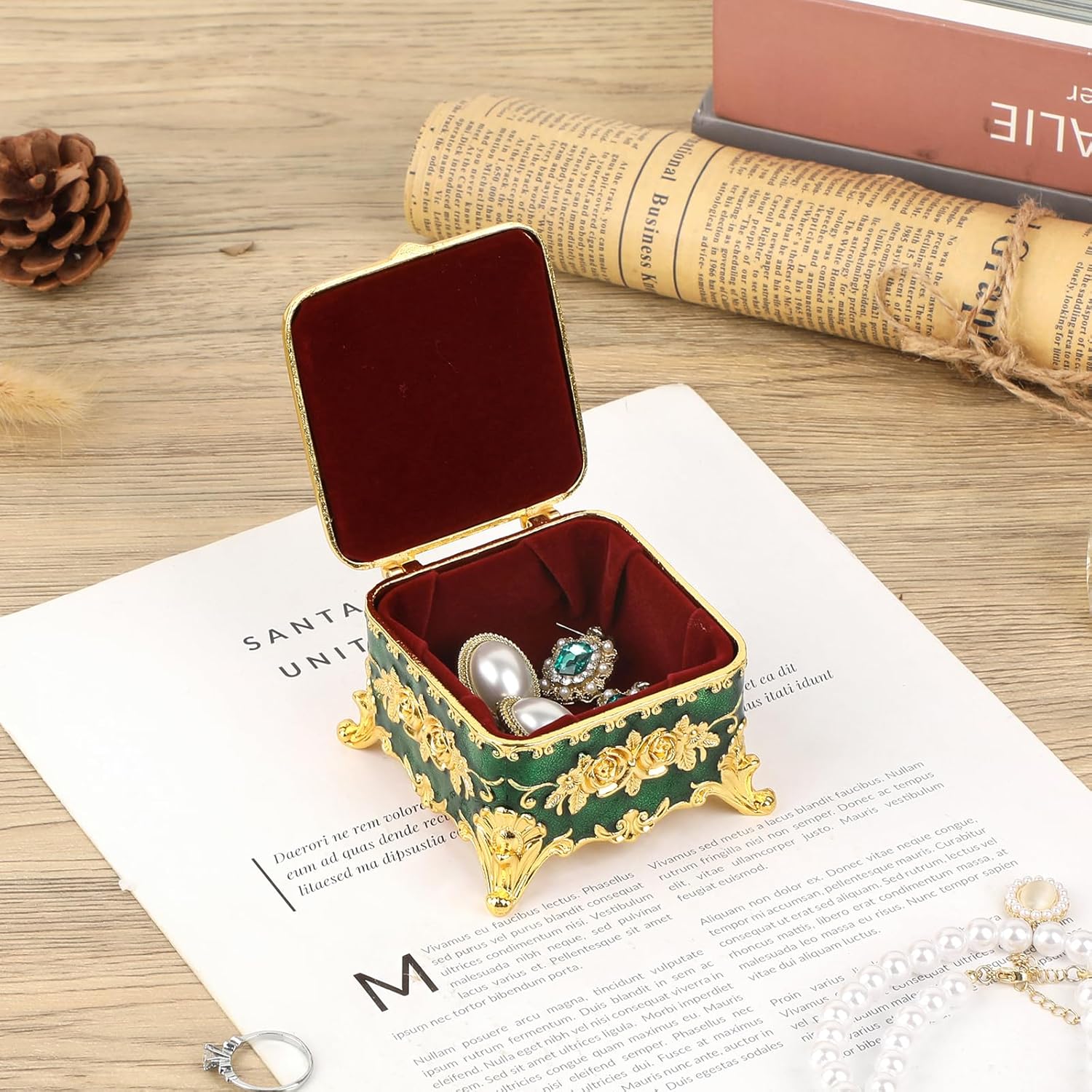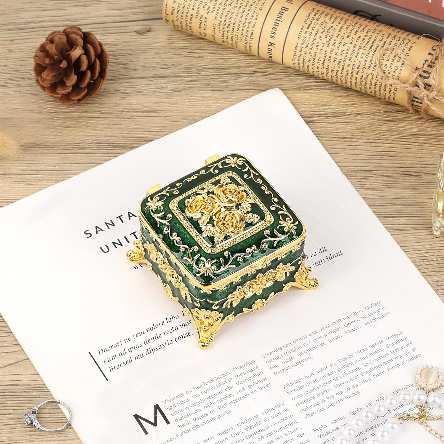 Hipiwe Vintage Jewelry Box Small Trinket Storage Organizer Box Gold Metal Chest Ring Case Treasure Chest Square Keepsake Boxes for Earrings Necklace Gift for Women,Green