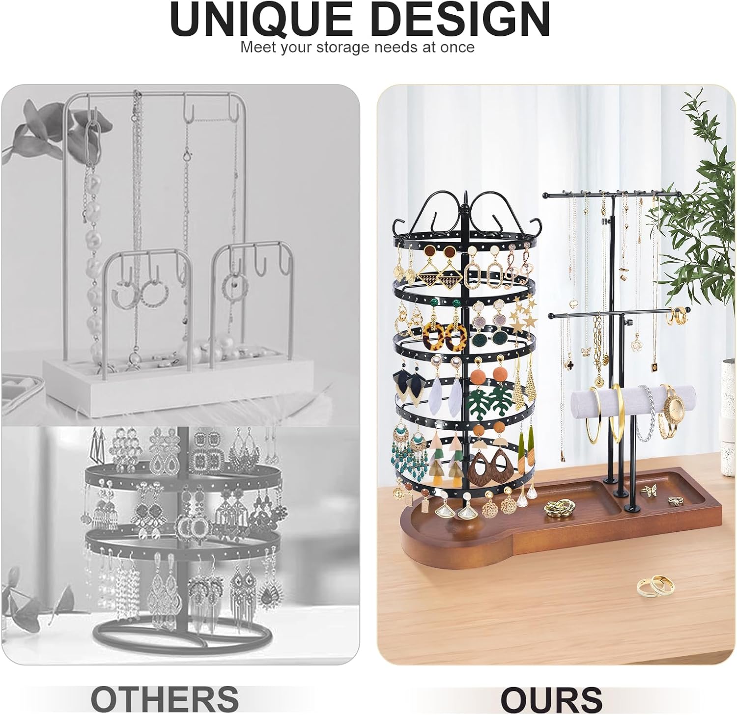Tangle free Solution: The 5 tier rotating earring rack has precisely spaced holes and adjustable clips to prevent earrings from tangling. The necklace holder’s height-adjustable switch ensures your necklaces remain knot-free, making accessorizing a breeze