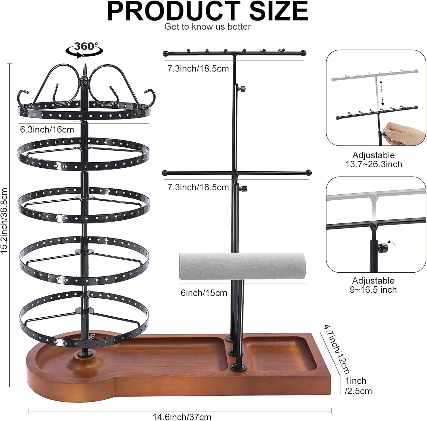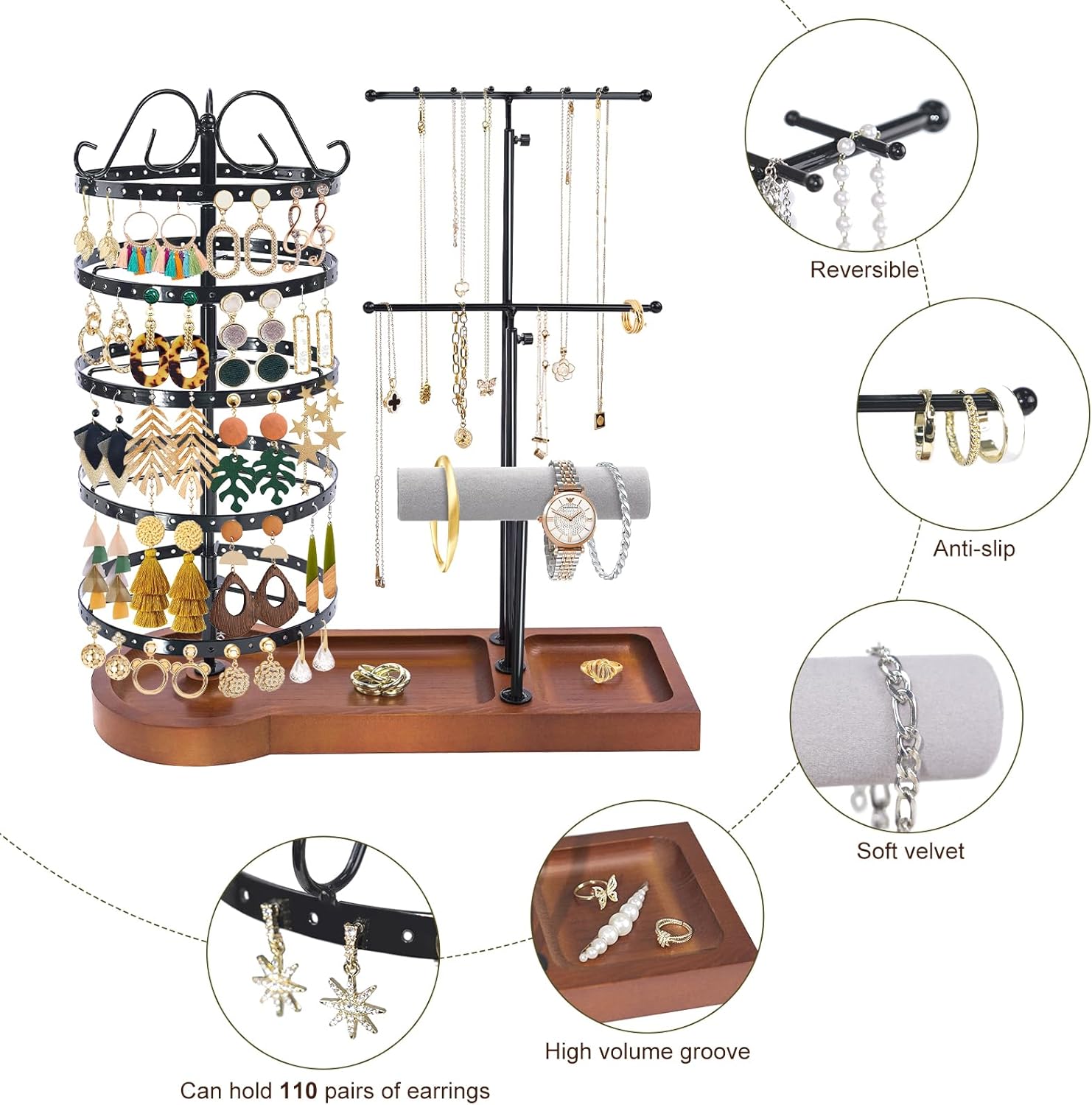 Jewelry Organizer Stand, Metal Rotating Earring Holder Organizer, Multi-Functional Adjustable Necklace Rack Holder Bracelet Watch Holder for Jewelry Earrings Ring, Black