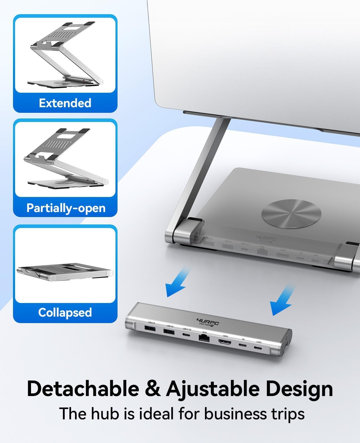 Detached Hub & Foldable – The bottom small USB-C hub uses magnetic technology and can be detached easily, which is very suitable for carrying on business trips and travel. The laptop docking station stand can also be fully foldable, it is so compact and space-saving, which is useful for people who travel