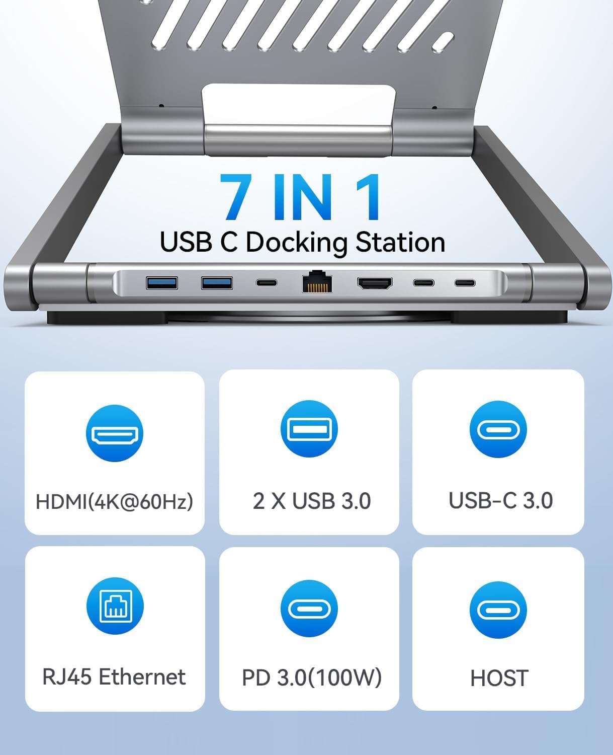 Laptop Docking Station Stand 4K@60Hz for MacBook Pro/Air M3/M4, Dell/HP/Surface/Lenovo/Chromebook, Laptop USB Hub Stand with HDMI, 3 USB, Ethernet, PD 3.0, Adjustable Dock with 360° Rotate Base