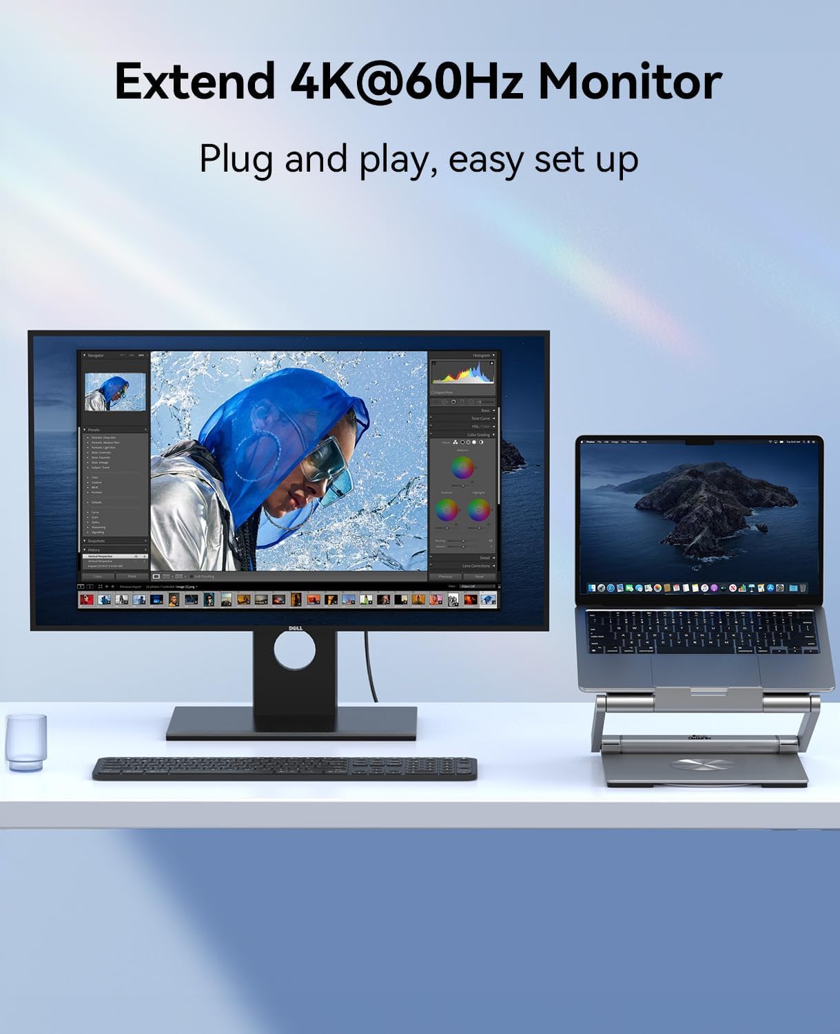 Plug and Play 4K@60Hz HDMI Display – This MacBook Pro docking station can extend one 4K@60Hz (3840×2160@60Hz) monitor via the HDMI port, so that you can handle work with 2 screens (laptop+monitor), and the Ultra high definition is perfect for those who need to deal with ultra HD pictures and video output tasks. What’s more, this USB C laptop dock is plug-and-play, no need to install any driver