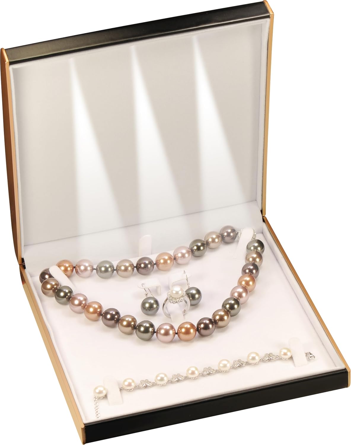 LED Black Extra Large Necklace Pendant Earrings Ring Bracelet Box Luxury PU Leather Dome Top Designed with Gold Color Painted on the Sides Big Jewelry Sets Gift Holder Box with Light for Men for Women