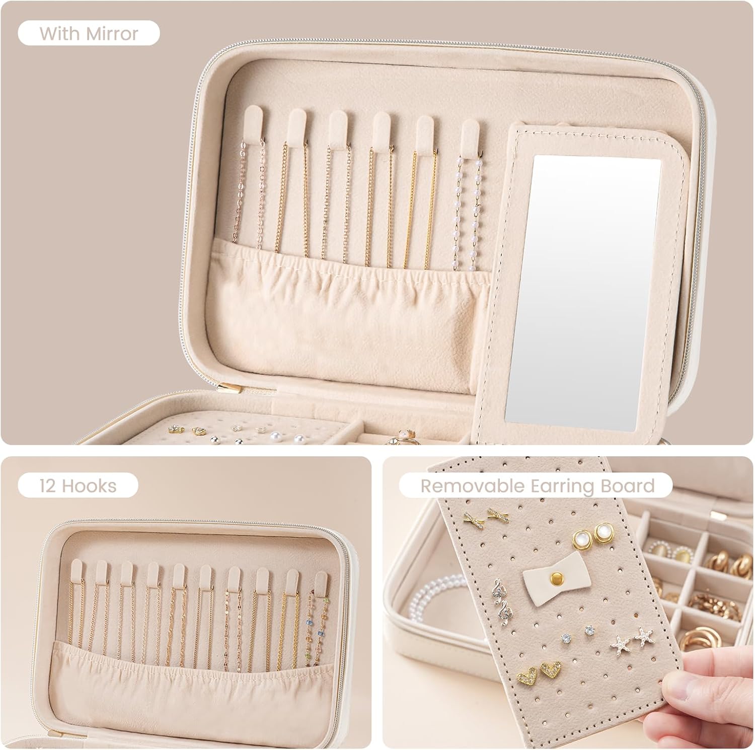 Lolalet Travel Jewelry Case for Women, Travel Jewelry Organizer Box with Mirror & Clear Storage Bag, Small Portable Traveling Earring Necklace Bracelet Ring Case, Bridesmaid Gifts -Medium, White