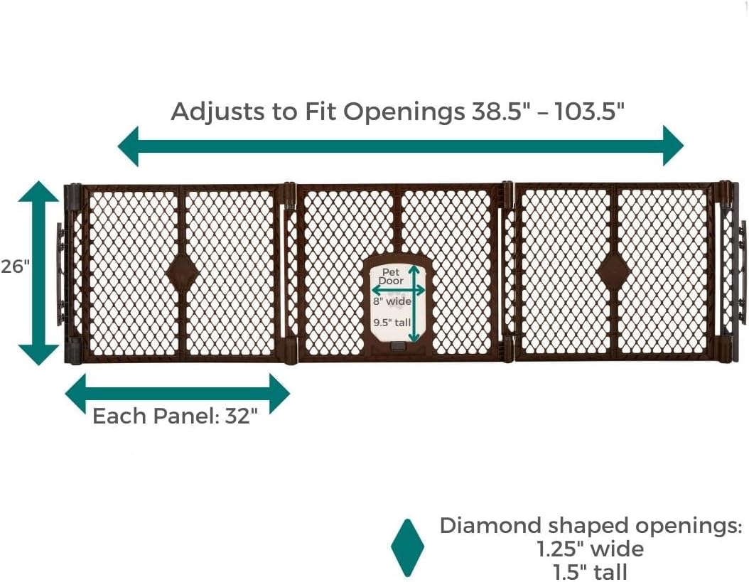 The MyPet Extra-Wide Gate with Small Pet Door from North States is a safe pet containment system which features an exclusive swinging door for pets. The 9.5″ x 8″ pet door swings freely allowing your pet the freedom to come and go as they please. Want to contain your pet? No problem! The small door also locks for full containment, offering you peace of mind. Hardware mount this gate onto straight or angled walls – the pivot points on the panels allow you to position the gate with ease. Easily remove the gate from the wall hinge with a simple press and lift motion. This barrier is the perfect solution for homes with large hallways or awkward spaces that need blocking off. Fits openings from 38.5″ to 103.5″ wide. Whether you need extra wide pet gates for large openings, pet gates with walk through door for cats, porch gate for dogs, or a cat safety gate, the MyPet Extra-Wide Gate is a great choice. Proudly made in the USA.