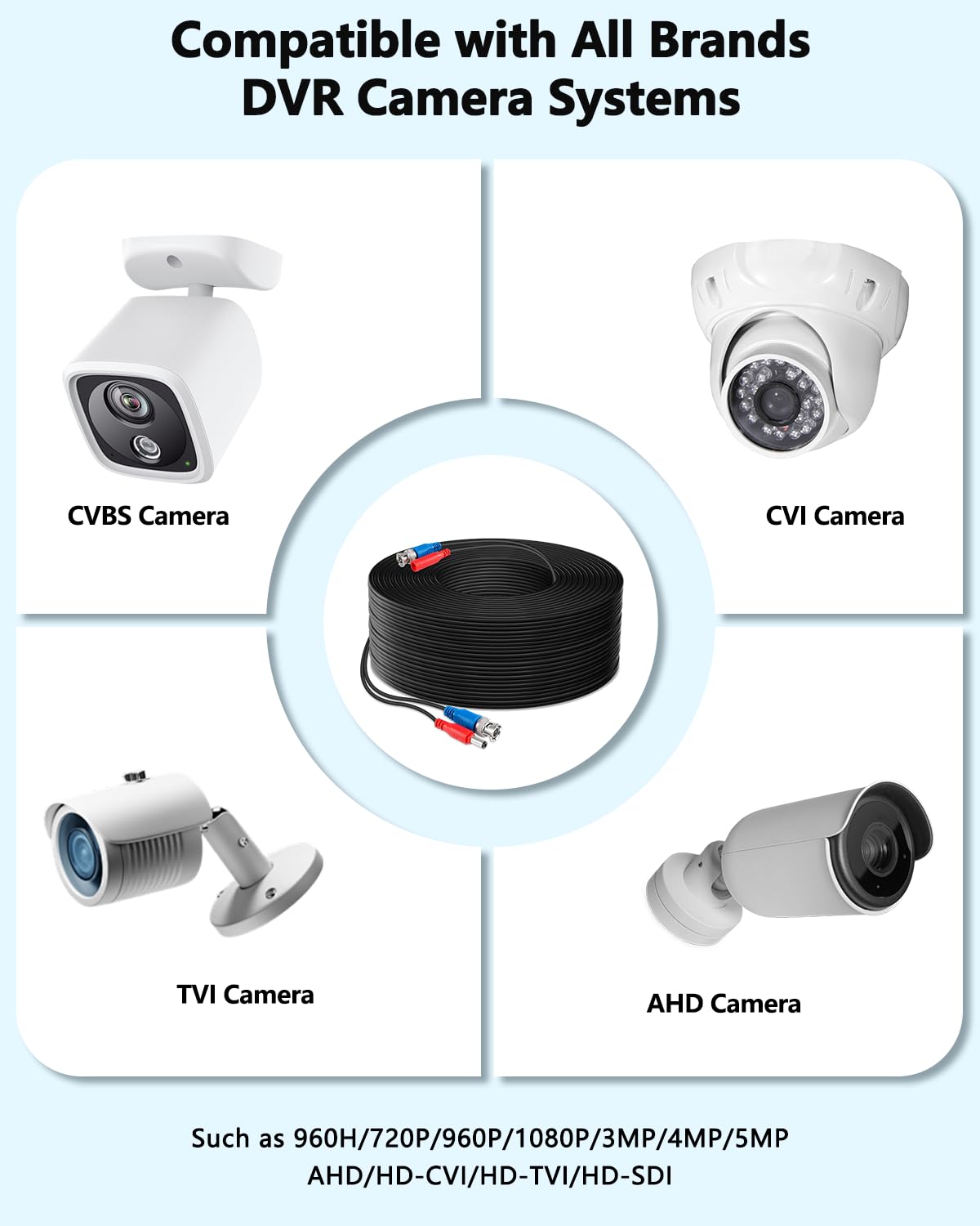 {Wide Compatibility} The BNC cable is compatible with all brand surveillance dvr camera and cctv camera security system, including 960H/720P/960P/1080P/3MP/4MP/5MP resolutions, as well as AHD, CVI, and TVI formats.