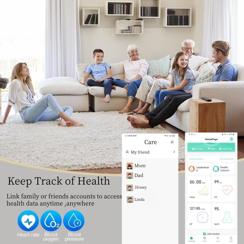 【Family Care】 The fitness ring allows you to add family members as friends, enabling you to monitor their health data at any time, such as step count, blood oxygen levels, sleep patterns, and heart rate. With this feature, you can offer timely care for your loved ones and cherish those precious family moments.