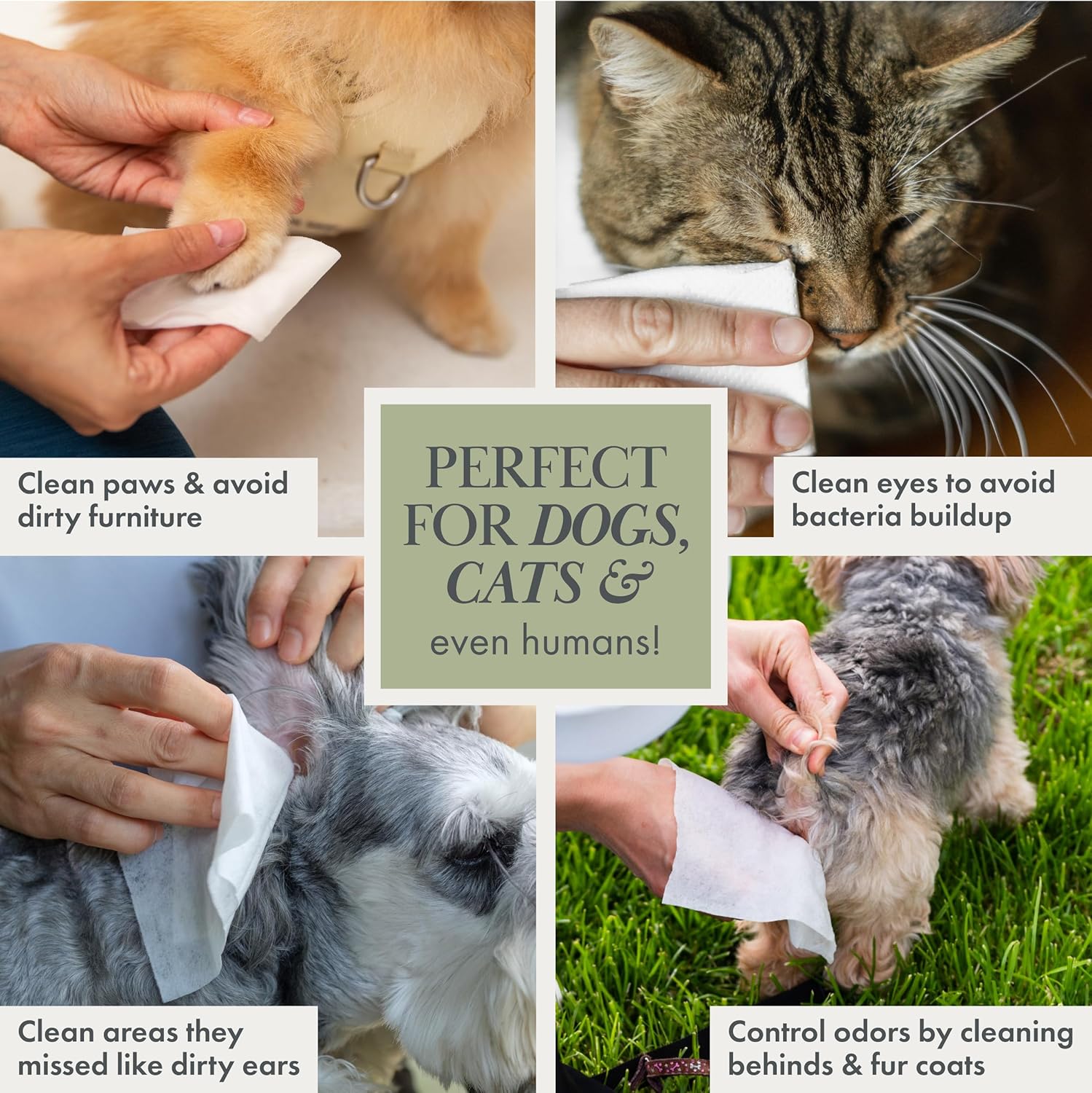 EFFICIENT DAILY DIRT & SMELL REMOVAL: Our unscented, Aloe Vera and Chamomile-infused formula is a top-notch pet grooming solution, perfect for dogs and cats. From dog ear wipes to cat care, our wipes effectively remove dirt and smells while also nurturing your dog’s coat, acting as both a stain remover and deodorizer.