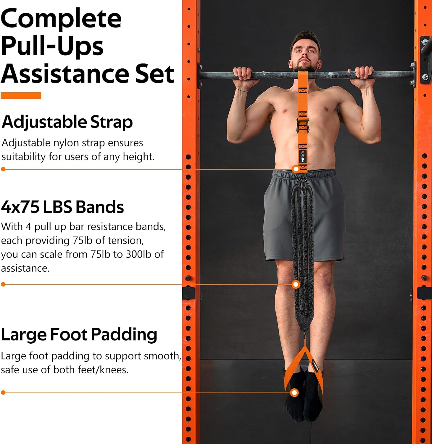 【Complete 75-300lbs Adjustable Resistance】: Our set includes 4 heavy-duty elastic bands (each 75lbs) and an adjustable strap. Combine them to scale from 75lb to 300lb of assistance. Perfect for all fitness levels – start with maximum support and reduce as you get stronger until you can perform unassisted pull-ups like a pro!