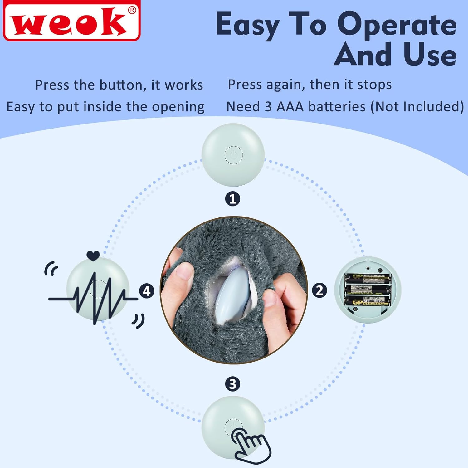 Heartbeat Simulator Module + Plush Toy:The WEOK product contain a plush dog toy and a real heartbeat simulator Module. The heartbeat Simulator need 3 AAA batteries(No battery included in the package). Press the button, then the heartbeat module works. Easy to operate.