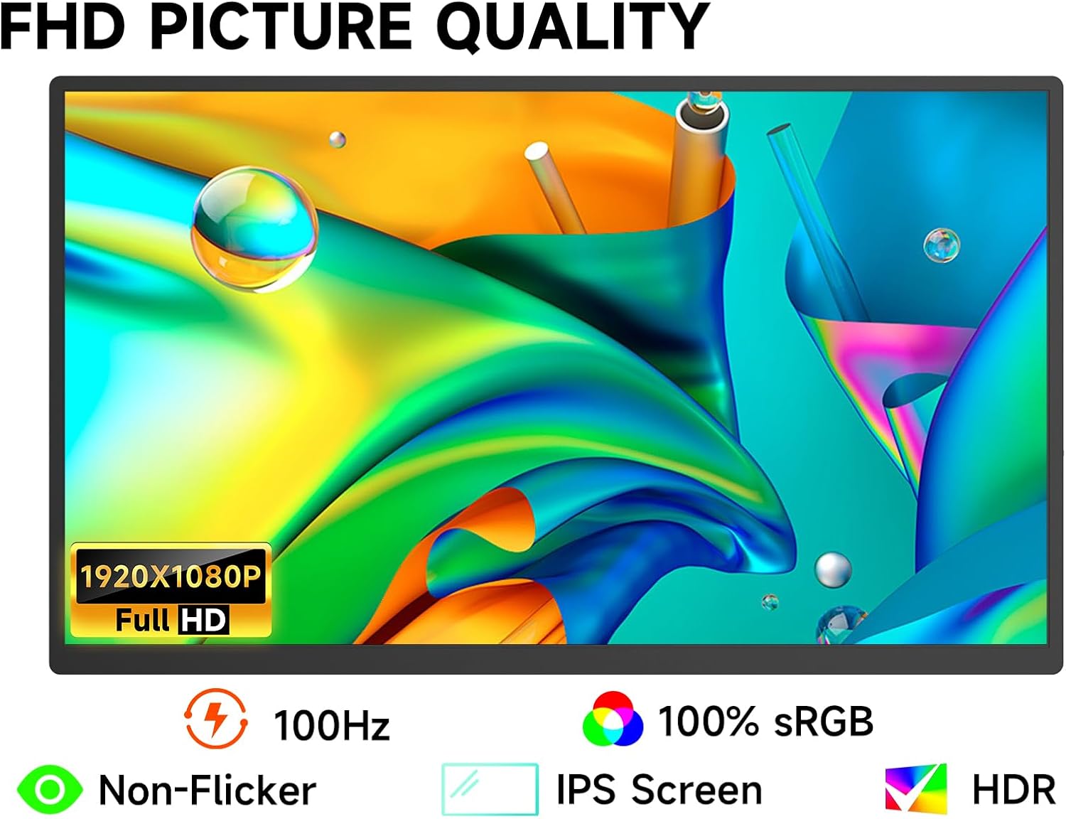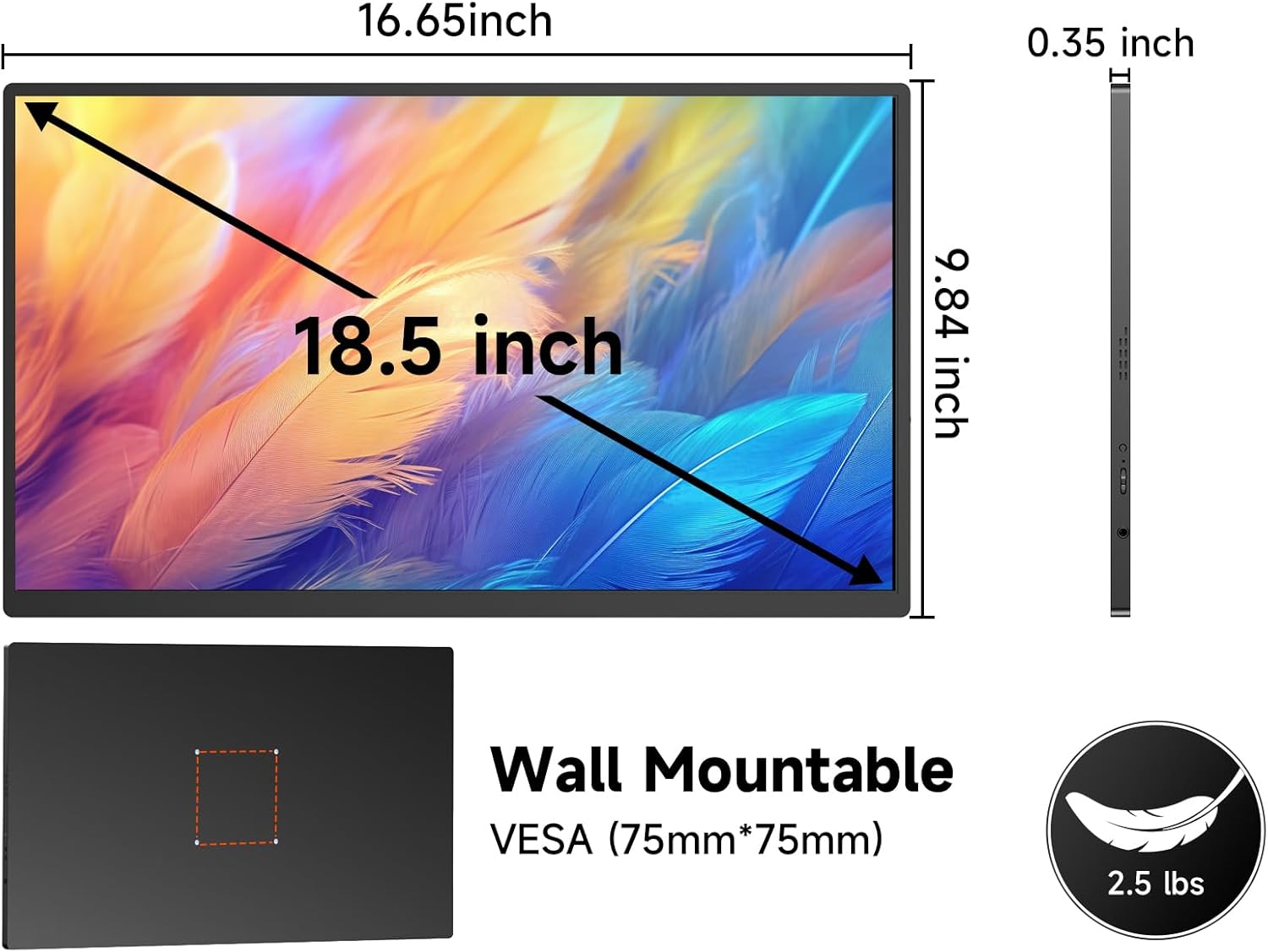 [100Hz Refresh Rate] The 18.5‘’ portable monitor features an ultra-high refresh rate for lower input lag and higher-quality video, work and gaming screen quality for greater motion clarity and smoother visuals in working and gaming