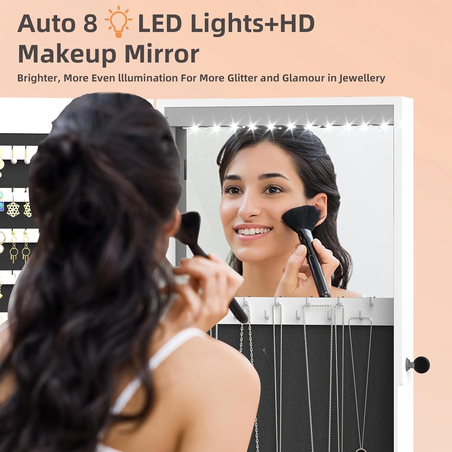 RQZ Product image 8 LEDs Mirror Jewelry Cabinet, Large Jewelry Armoire Organizer, Wall or Door Mounted Lockable Jewelry Storage with Interior Mirror, Large Capacity Storage (47.4″ H)
