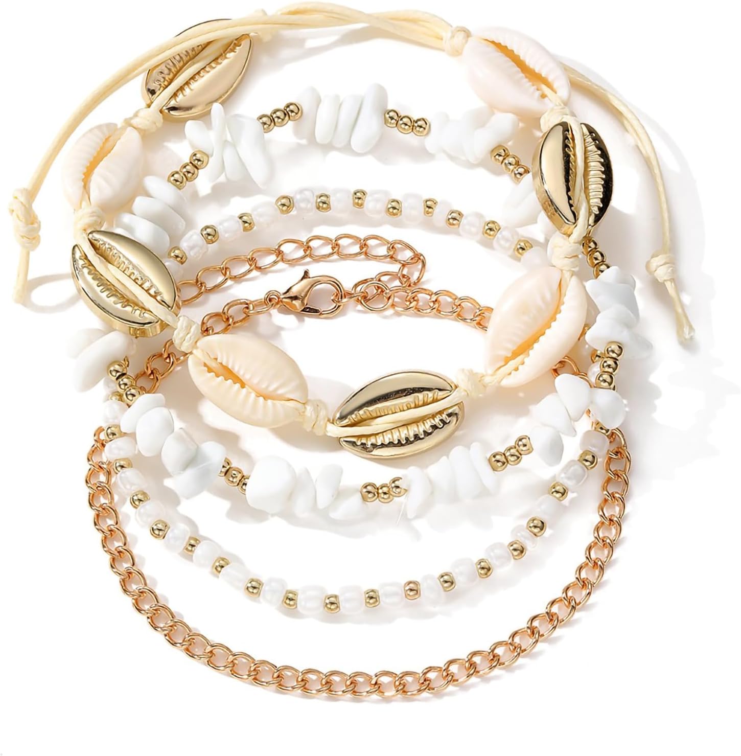 Shell Ankle Bracelet Set for Women, Gold Boho Bead Adjustable Anklet, Hawaiian Beach Seashell Pearl Heart Starfish Conch Foot Jewelry Gifts