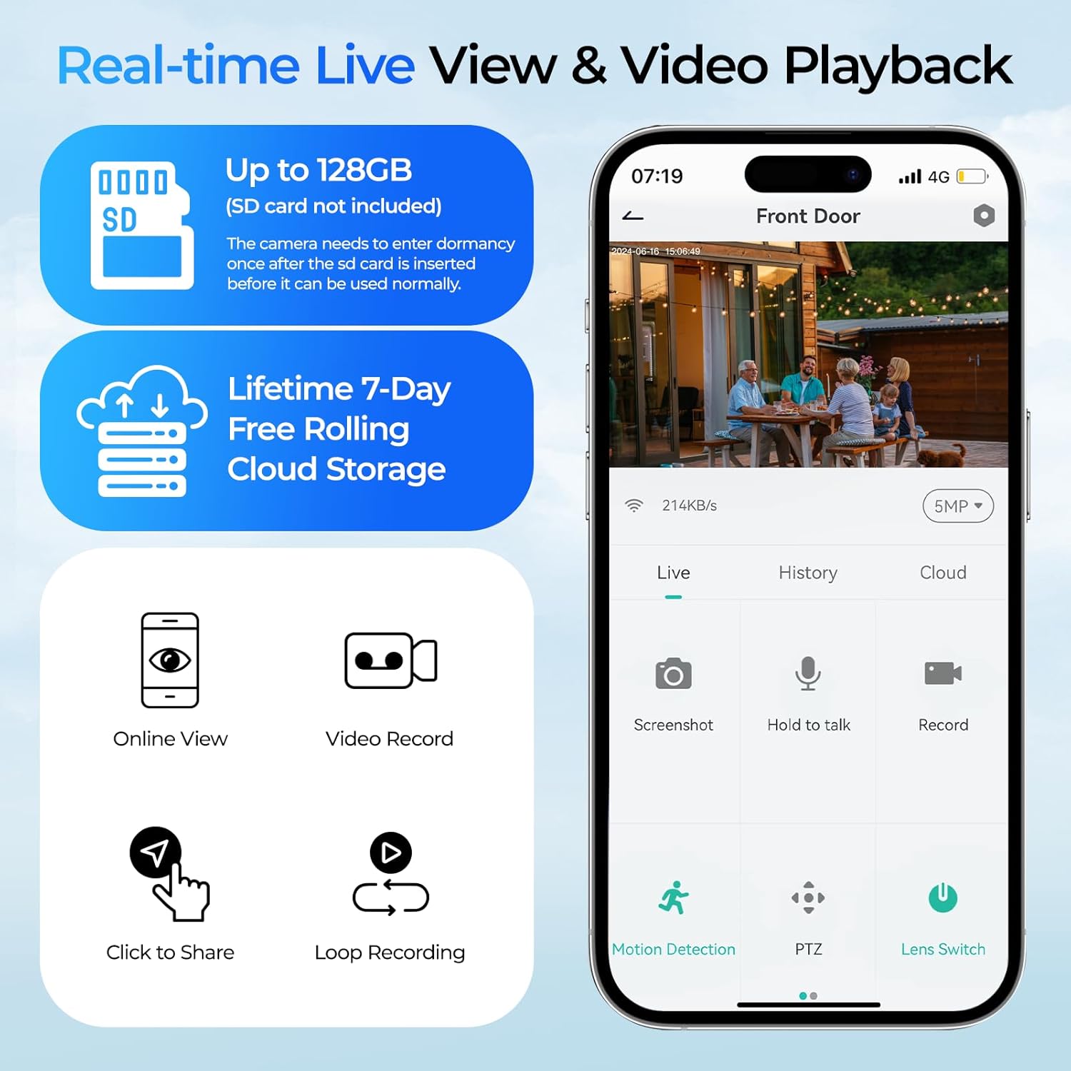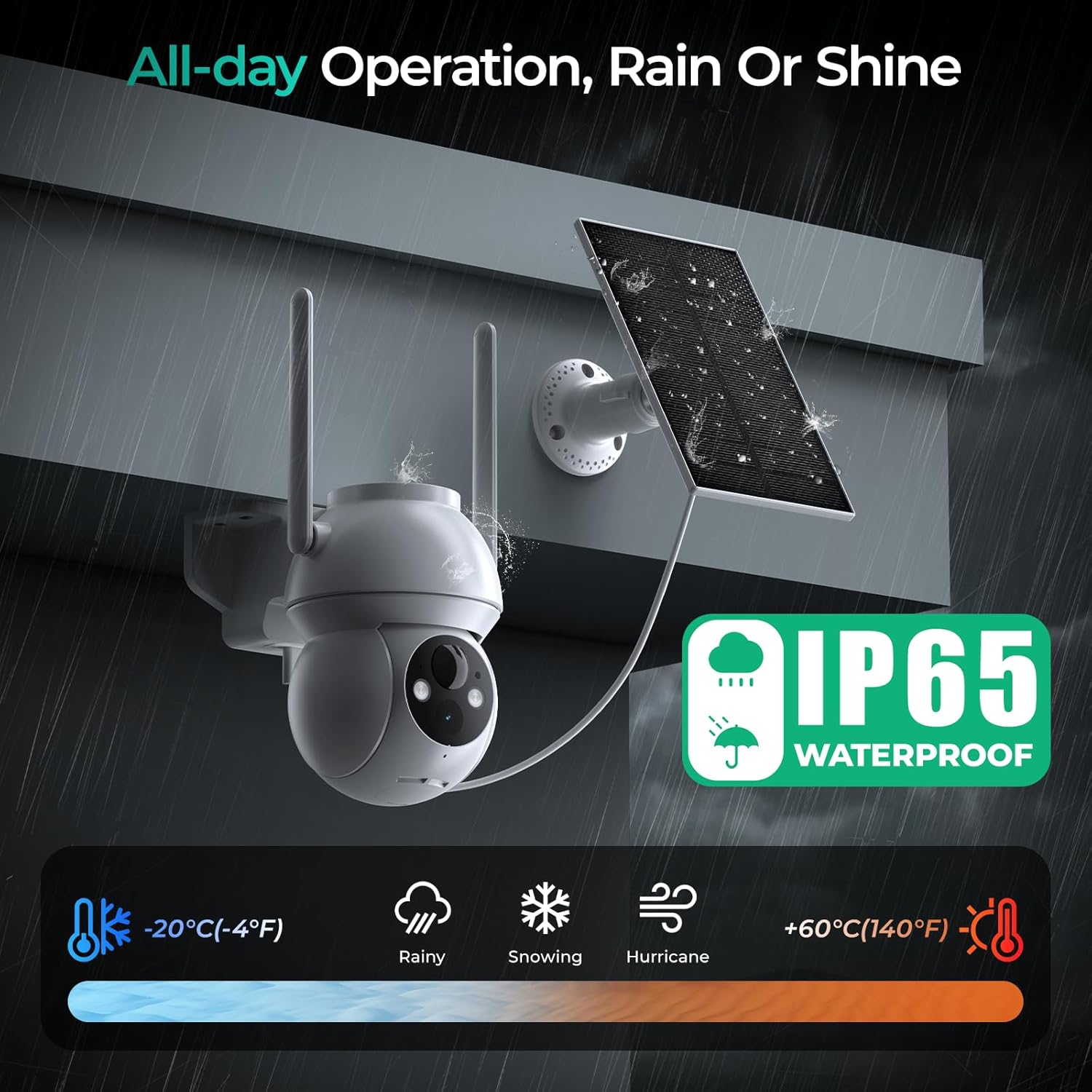【No Monthly Fees, & IP65 Weatherproof】 Security cameras wireless outdoor supports local SD card storage (up to 128GB,not included) and cloud storage (with a free 7-day rolling cloud storage, no subscription required). Data is encrypted during transmission to ensure exclusive access. With an IP65 waterproof rating, solar camera outdoor wireless can withstand various harsh weather conditions, ensuring uninterrupted operation throughout the year.