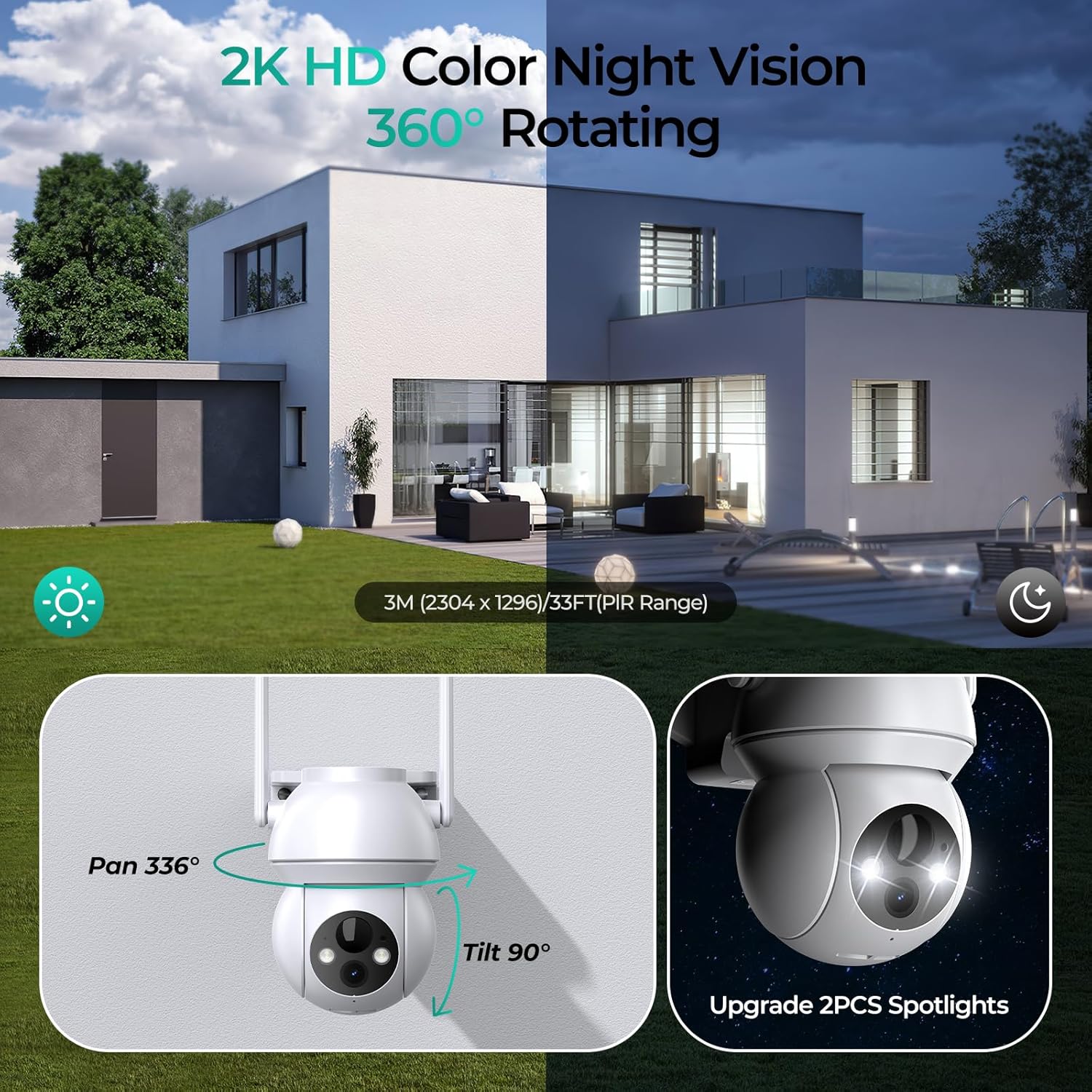 【2K HD Color Night Vision & 360° Panoramic Coverage】 Wireless home security camera features 3MP ultra-high-definition color night vision, supporting 336° horizontal rotation and 90° vertical rotation to achieve 360° panoramic monitoring. Equipped with white light illumination and infrared sensors, it captures clear images and videos even in complete darkness, ensuring reliable surveillance at night.