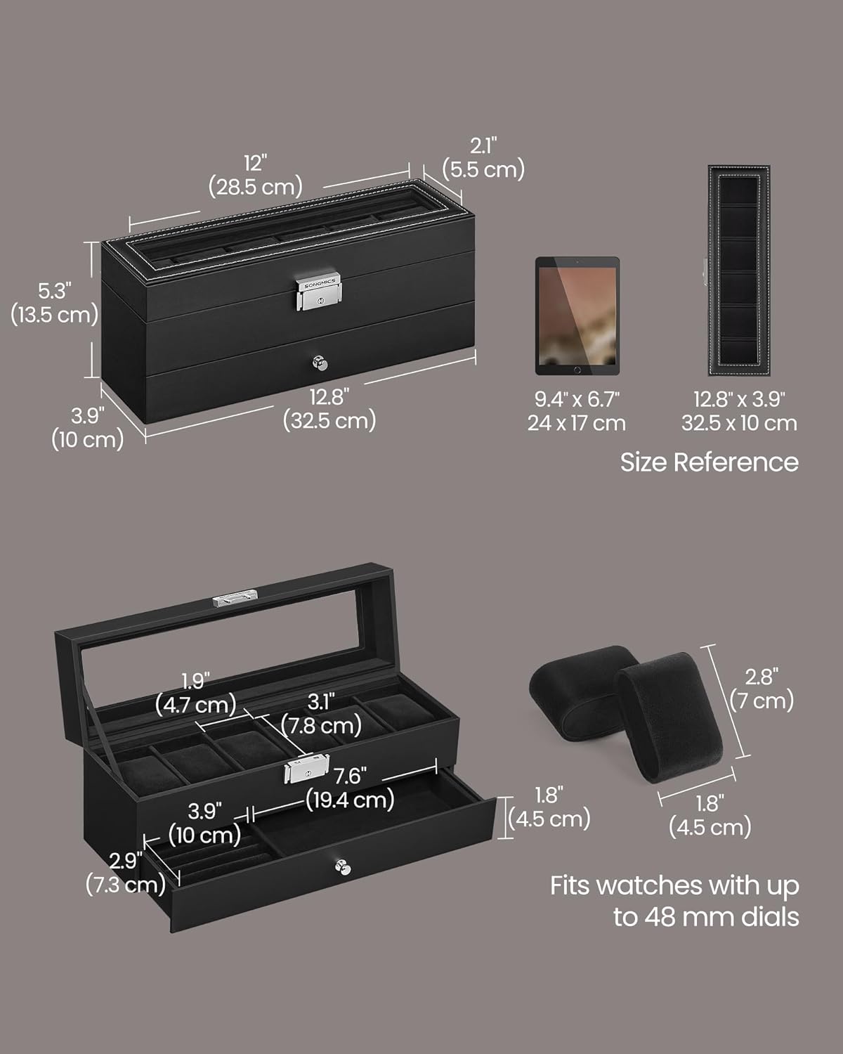 2-Layer Storage: The top layer with 6 slots offers a cozy home for your watches with a dial size up to 48 mm, and a bottom drawer with various areas offers extra space for your necklaces, rings, earrings, and more