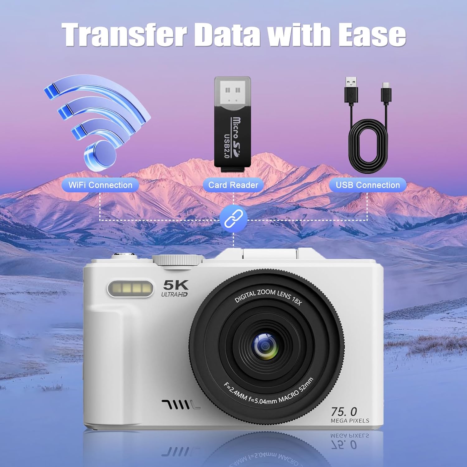 WGM 5K Digital Camera,7500MP HD Photography Camera,with 180° Flip Screen,HD WiFi Compact Camera with Flash,18X Digital Zoom,32GB TF Card & 2 Batteries,for Teens,Students,Vlogging,Travel(White