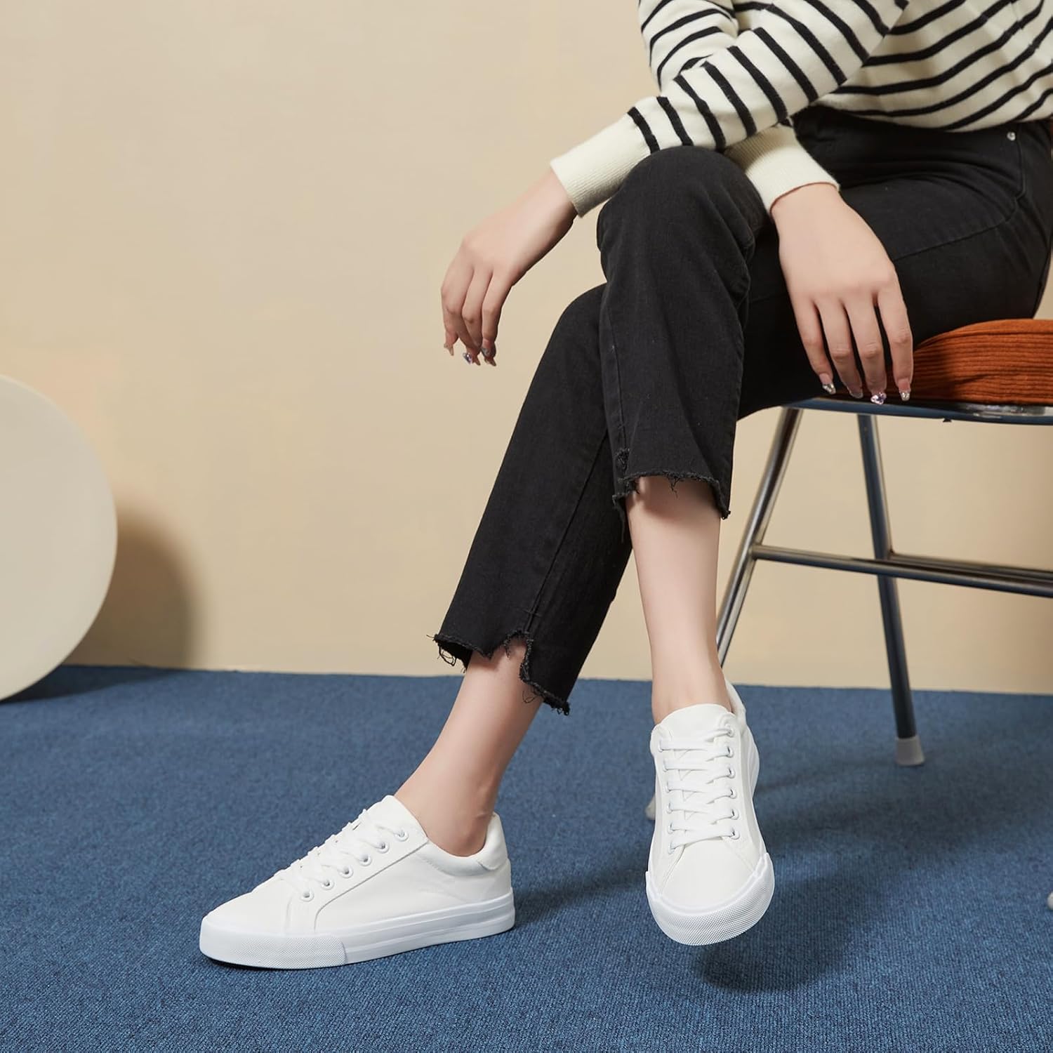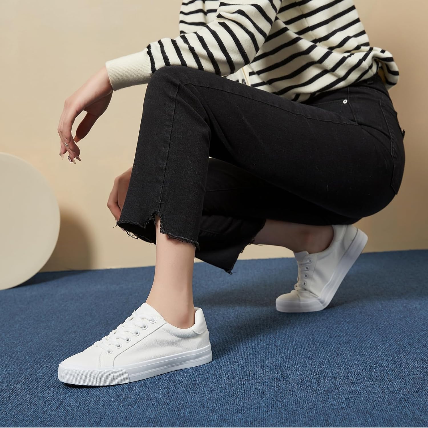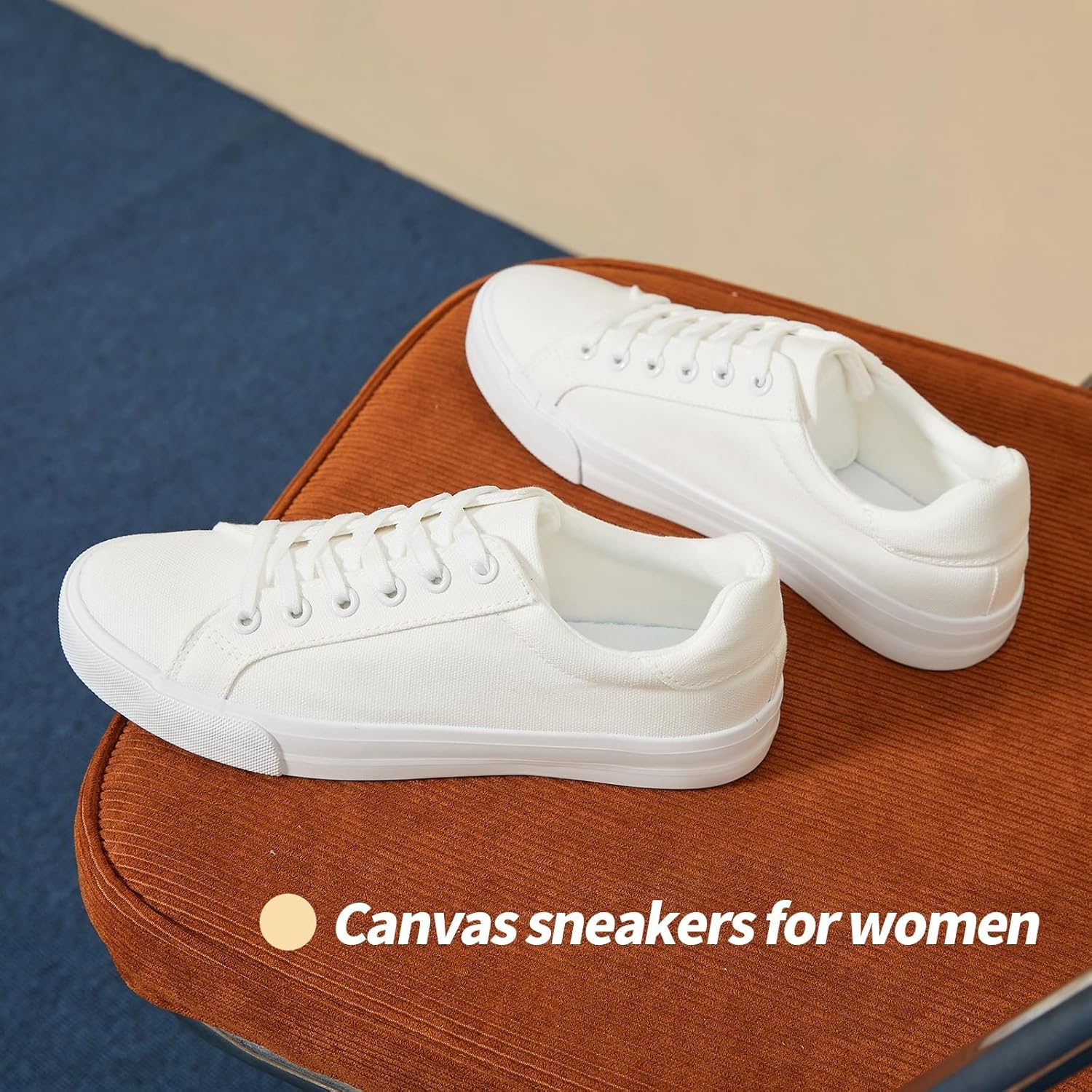 Witwatia Womens White Sneakers Lace Up Canvas White Tennis Shoes Cozy Low Top Walking Shoes for Women