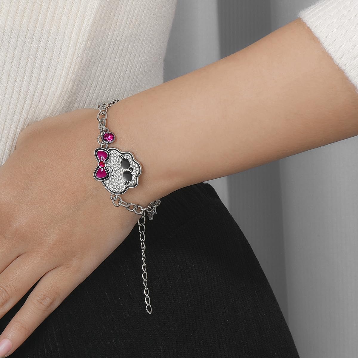 For the women who dances between dark allure and playful charm, this skull bracelet is your new signature piece. The pink rhinestone bow perched on a skull whispers I im delicate but deadly, while twin matte finish bone charms add streetwise grit.